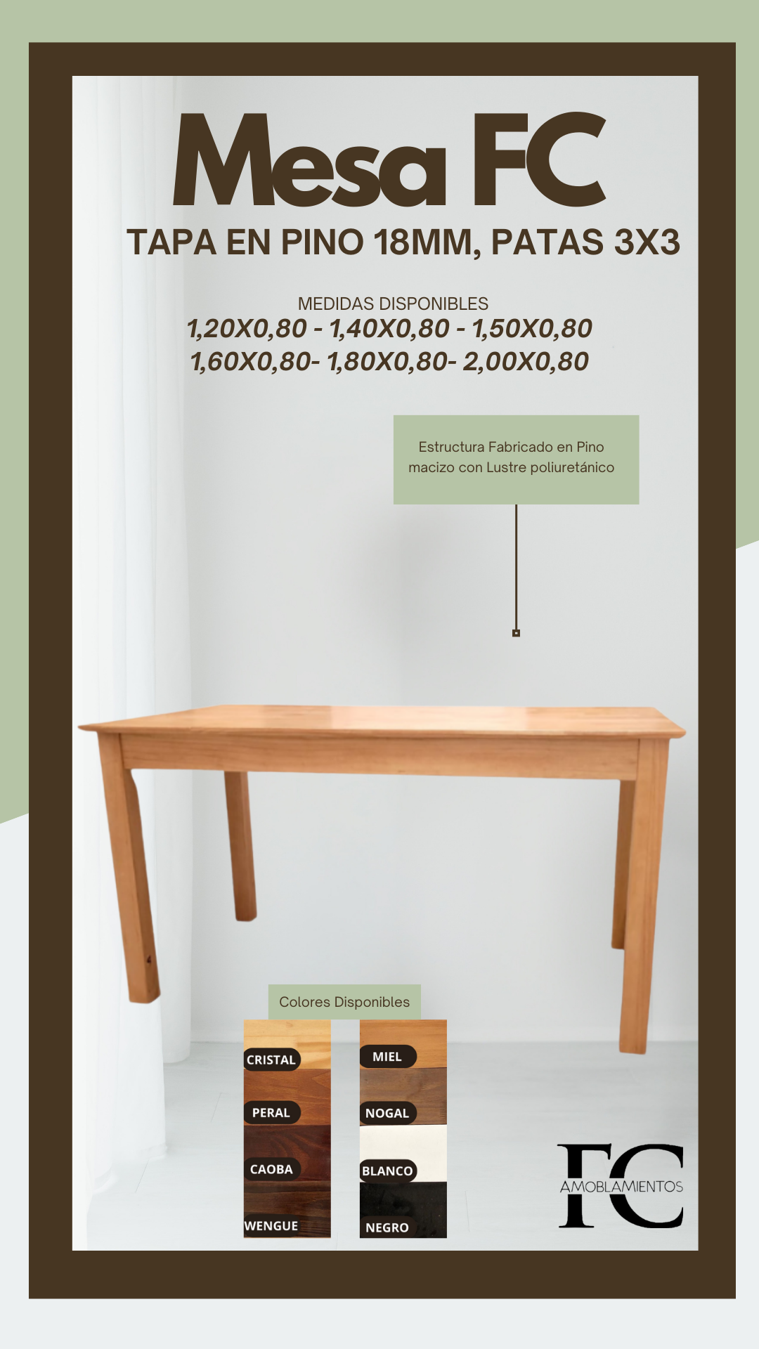 Está fabricada con patas 3X3 y estructura de madera de alta calidad y durabilidad. La tapa de la mesa está hecha con madera de Pino de primera con patas y gualdera con lustre poliuretánico, la tapa es laqueada que proporciona una superficie lisa y resistente al desgaste.